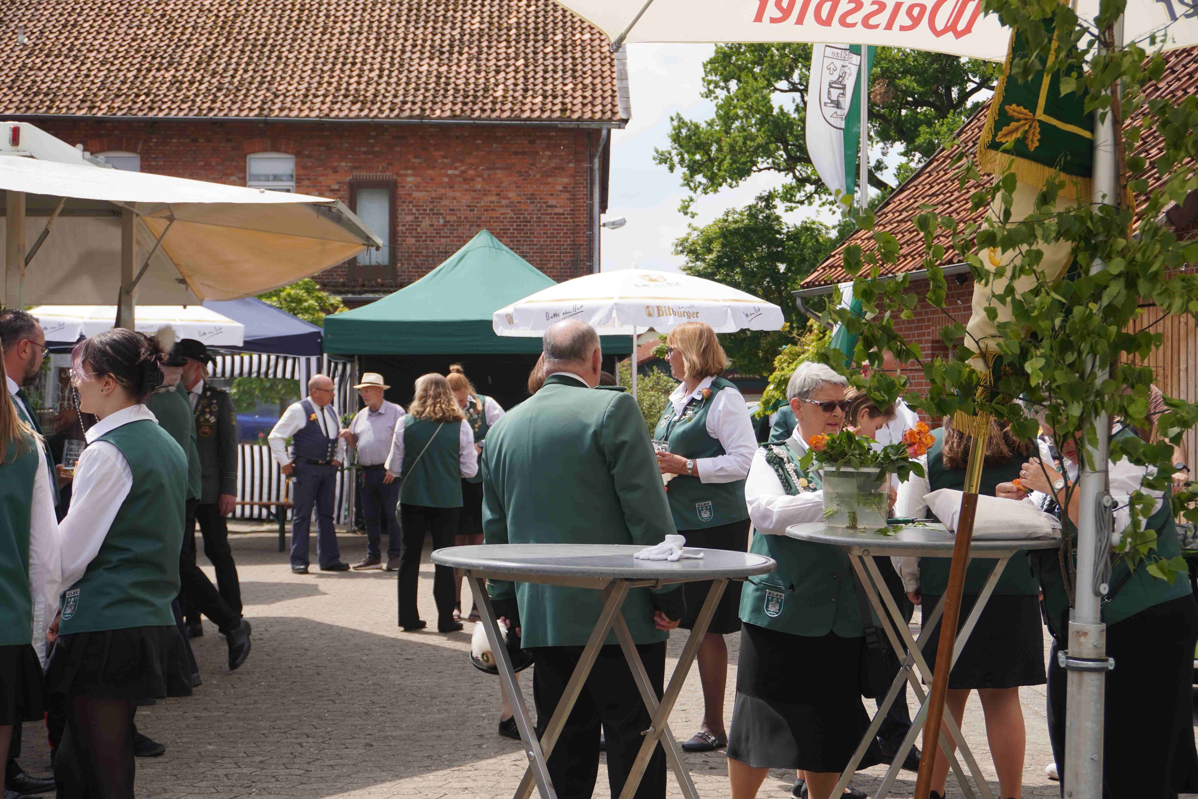 Am Sonntag startete das Fest dann mit dem öffentlichen Frühstück zu dem sich viele Schützen und Dorfbewohner auf dem Saal des Gasthauses Goltermann einfanden. Begleitet durch den Musikzug der Freiwilligen Feuerwehr Elze unter der Leitung von Marius Minke ließ man sich das Festessen schmecken und es folgten Ehrungen für langjährige Mitgliedschaften. Der Kreisschützenmeister Michael Freiberg und die Kreisschützenmeisterin Christina Böttcher ehrten Gerhard Thies, Hubert Wittbold und Bernd Woltmann für 70-jährige Mitgliedschaft, Thea Hetzke für 50-jährige Mitgliedschaft und Kristina Ciczewski, Friedel Sawrin und Hans-Jörg Sawrin für 25-jährige Mitgliedschaft im Deutschen Schützenbund. Geehrt wurde auch Till Reichenbach für sein Wirken für das deutsche Schützenwesen mit der bronzenen Ehrennadel des Niedersächsischen Sportschützenverbandes.